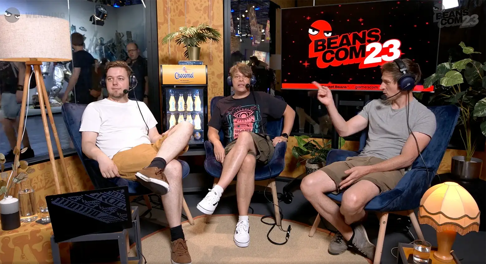 Das gläserne GAMESCOM Studio der ROCKET BEANS ganz cremig und mit einem prallgefülten CHOCOMEL Kühlschrank.